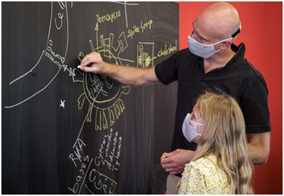 ![]() HeiQ联合创始人兼集团首席执行官Carlo Centonze先生向女儿解释HeiQ Viroblock的机制。(照片由HeiQ提供)