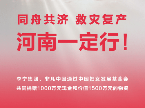 在了解到防汛救灾具体需求之后,李宁集团、非凡中国通过全国妇联中国妇女发展基金会共同捐赠1000万元现金和价值1500万元的物资,配合当地政府,重点用于受灾群众和一线救援人员的生活保障、灾区健康防疫和灾后恢复与重建工作。目前,现金和物资都已捐赠到位,首批物资已经装车完毕,准备运往河南灾区,我们在行动!同舟共济,救灾复产,河南一定行!