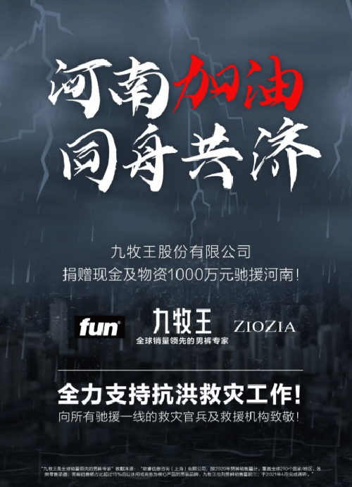 一方有难,八方支援,九牧王心系受灾群众,7月22日公司紧急决定,九牧王股份有限公司携旗下品牌九牧王、FUN、ZIOZIA向河南捐赠现金及物资合计1000万元,用于保障当地群众人身安全、生活需求及支援灾后恢复工作。