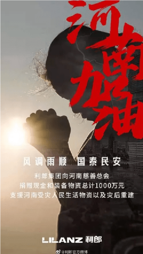 利郎集团通过河南慈善总会向灾区人民捐赠现金及生活必备物资共计1000万元。