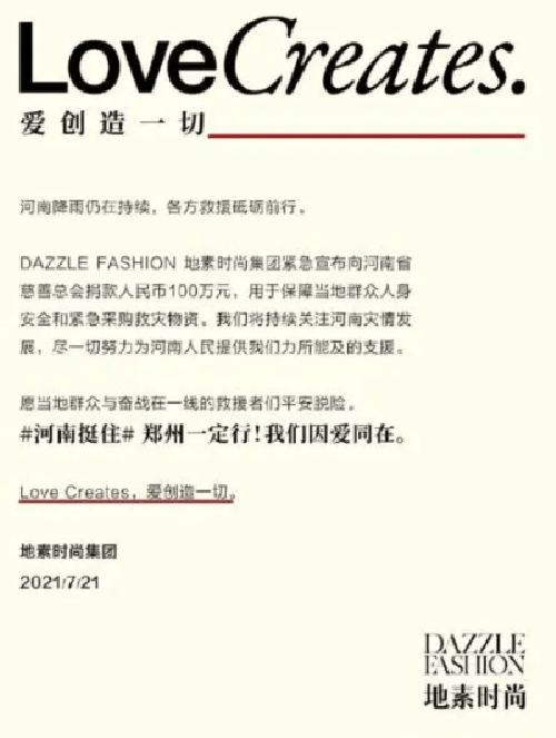 中国女装品牌 Dazzle 的母公司,地素时尚集团宣布向河南省慈善总会捐款 100万元,用于保障当地群众的人身安全和紧急采购救灾物资。
