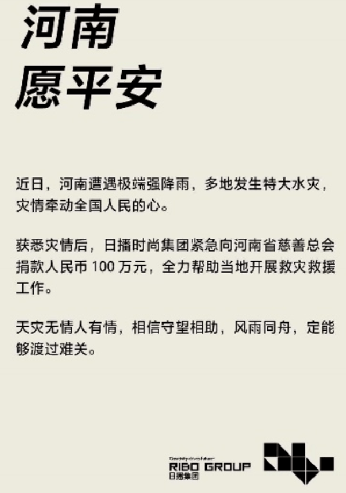 7月22日,日播时尚紧急通过河南省慈善总会捐助人民币100万元,全力帮助当地开展救灾救援工作。此次,日播时尚第一时间火速驰援河南,再次用行动践行了公司“生态发展、敬天爱人”的经营理念。灾难当前,公司向奋斗在救灾一线的工作人员致敬,也为受灾群众祈愿平安健康。