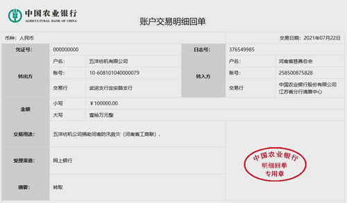 公司董事长王敏其代表河南灾区感谢全体五洋人的捐赠与大爱!祝福河南同胞早日战胜洪灾,建设美好家园!祝全体五洋人心有大爱,阖家幸福!