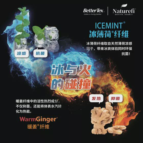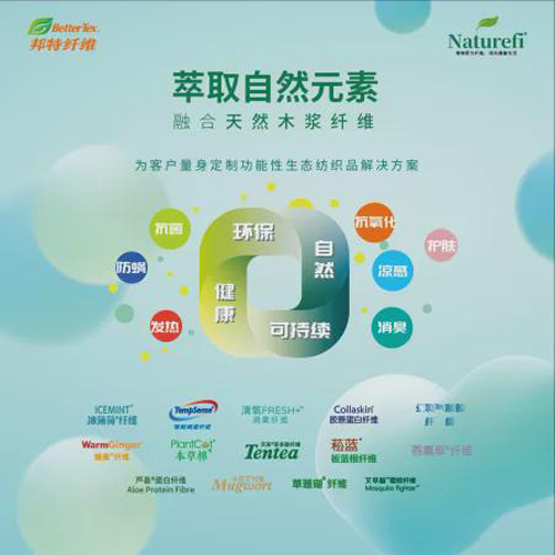 邦特纤维专注于天然、绿色、低碳、环保新型纤维、纱线的自主研发和生产,拥有专业的功能性纤维生产基地,现已成功研发、生产Naturefi天然纤维系列:天茶?茶多酚纤维、暖姜®纤维、冰薄荷®纤维、Collaskin®胶原蛋白纤维、Tempsense®智能调温纤维等,具有抗菌、抗病毒、消臭、防螨等多种功能,产品已获得近30项国家发明专利,并通过Oeko-Tex、FSC、SCS等多项生态、再生纺织品认证。