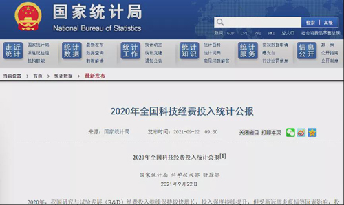 本刊记者-郝杰 9月22日,国家统计局、科技部、财政部联合发布《2020年全国科技经费投入统计公报》(以下简称《公报》)。《公报》数据显示,2020年我国R&D经费投入总量突破2.4万亿,达到24393.1亿元,比上年增加2249.5亿元,增长10.2%,;研究与试验发展(R&D)经费投入强度为2.40%,比上年提高0.16个百分点,提升幅度创近11年来新高。