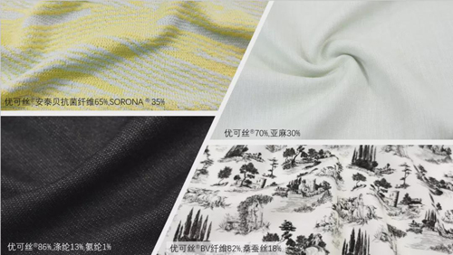 一直以来,在牛仔和家纺领域,粘胶类的纤维主要以低比例形式加入,为提升面料柔软舒适的手感和性价比。在今年的联盟推广过程中,一些企业另辟蹊径,将优可丝®的比例提升至70%左右,开发出别具特色的面料风格。比如,采用气流纺将优可丝®与麻搭配开发低支混纺纱织造结构疏松的沙罗面料用于家纺领域,面料轻薄透气而不失自然格调;通过涡流纺或长丝包芯纱的形式高比例混入优可丝®,再结合一定的染整工艺改进,很好地控制了面料缩率同时实现了牛仔面料风格手感的创新突破;或者将优可丝®安泰贝®抗菌纤维与SORONA®搭配开发横编毛衫面料,前者提供抗菌性和亲肤体验,后者提供蓬松性增加保暖效果;除此之外,高比例优可丝®BV与桑蚕丝搭配,高支高密织造平滑致密的丝质面料,复古风格图案印花强调面料的精致细节,打造极致的产品性价比。