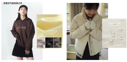 在针织领域中,常见的空气层面料多采用涤纶、锦纶等合成纤维编织完成,粘胶纤维虽然吸湿亲肤性更好,且可以增加面料的悬垂性,但出于弯折后易产生折痕的担心而不敢轻易尝试。在接触到赛得利联盟并深入了解了优可丝®的优势性能和赛得利研发团队的推广模式之后,企业与赛得利联合开展了一系列开发试验,最终开发开发出优可丝®空气层面料,在保证保形性的前提之下,增强了面料的穿着舒适性和时尚感。在机织领域中,防寒服面料基本都是合成纤维长丝来织造,既开发出“优弹®”针织面料之后,赛得利与联盟企业、终端品牌进一步开展合作,通过优可丝®短纤与SORONA®长丝交织的形式,并复合防水、防风等多重功能,打造出不止于暖的羽绒服面料。