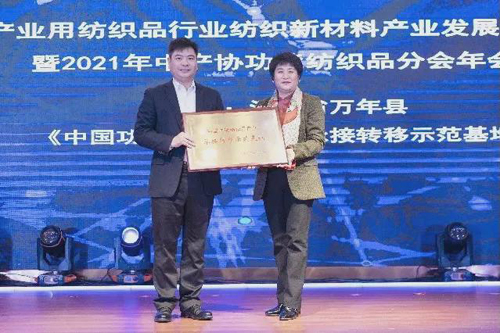 ![]() 中国产业用纺织品行业协会会长李桂梅为万年县授《中国功能纺织品产业承接转移示范基地》牌匾。