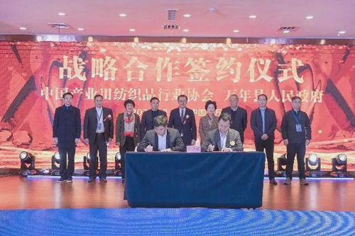 万年县纺织产业签约仪式,签约仪式分2批进行。第一环节:中国产业用纺织品行业协会副会长段守江、万年县人民政府副县长李锦春签订战略合作协议。