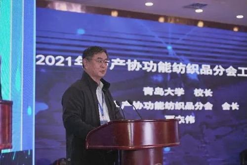 ![]() 青岛大学校长、中产协功能纺织品分会会长夏东伟作2021年功能纺织品分会工作报告。
