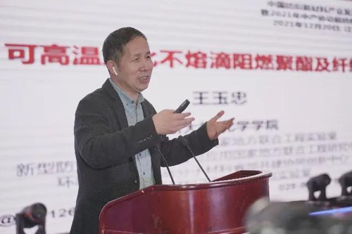 ![]() 中国工程院院士、四川大学教授王玉忠作了“可高温炭化不溶滴阻燃聚酯及纤维”主题报告。王玉忠指出,传统阻燃方法存在溶滴问题,这也是阻燃领域长期未解决的国际难题。他说,通过分子设计,在聚酯大分子链中引入可高温自交联基团,使共聚酯在高温或燃烧温度下快速发生快速“化学交联”,进而炭化,从而实现不溶滴和高阻燃性的目标,并且热释放速率和烟密度都显著下降。
