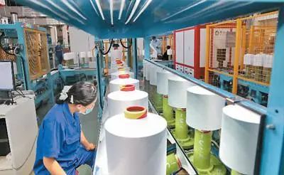 ![]() 图为浙江省宁波大发化纤有限公司用来制作再生涤纶短纤维的牵伸工艺生产车间。