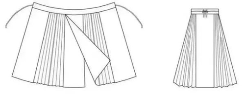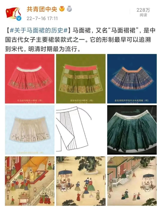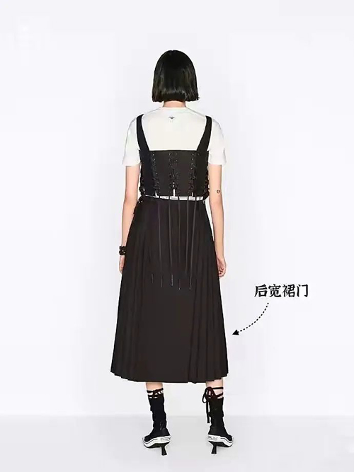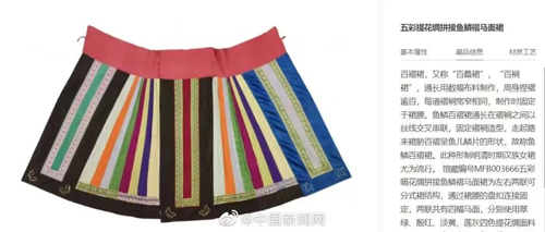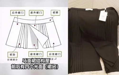 它整体呈固定结构——两片式、四裙门,四个裙门两两重合,侧面打褶,中间裙门重合而成的光面就是“马面”。而受争议的迪奥裙装,可以看到明显的两片式、褶裥设计。