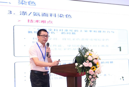 ![]() 广东德润纺织有限公司研发副经理徐斗峰以《针织化纤弹力面料的染整加工生产技术》为题,就针织化纤弹力面料的染整加工生产技术进行了介绍,并分享了自己在生产方面的心得体会。