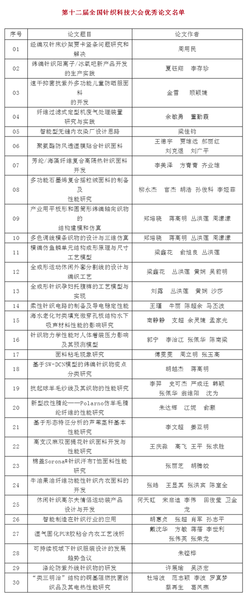 ![]() 中国针织工业协会专家技术委员会常务副主任、上海嘉麟杰纺织科技有限公司副总经理杨启东宣读了《关于表彰第十二届全国针织科技大会优秀论文的决定》,《经编双针床纱架贾卡竖条问题研究和解决》等30篇论文获评第十二届全国针织科技大会优秀论文(名单附后)。