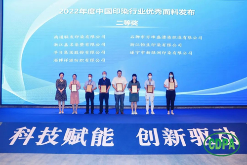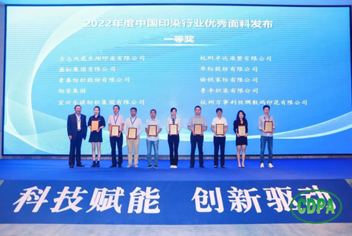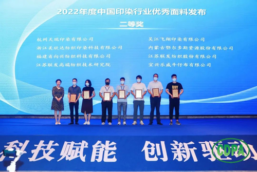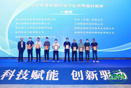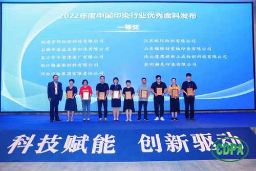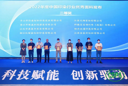 ![]() 会上,中国印染行业协会副会长兼秘书长林琳宣读了“关于发布2022年度中国印染行业优秀面料获奖产品及企业名单的决定”。杭州卓达染整有限公司醋涤缎面料荣获2022年度中国印染行业优秀面料特等奖;青岛凤凰东翔印染有限公司超级发丝纹机印蜡染面料等 49件产品荣获2022年度中国印染行业优秀面料一等奖;杭州天瑞印染有限公司新意面料等48 件产品荣获2022年度中国印染行业优秀面料二等奖。