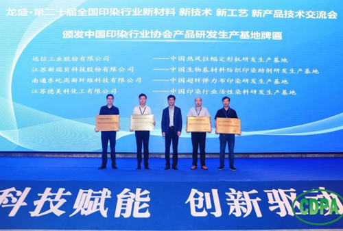 随后,林琳还宣读了《关于批准远信工业股份有限公司等单位为中国印染行业协会产品研发生产基地的决定》。远信工业股份有限公司为“中国热风拉幅定形机研发生产基地”,江苏新瑞贝科技股份有限公司为“中国生物基材料纺织印染助剂研发生产基地”,南通东屹高新纤维科技有限公司为“中国超纤弹力布印染研发生产基地”,江苏德美科化工有限公司为“中国印染行业活性染料研发生产基地”,现场还颁授了牌匾。