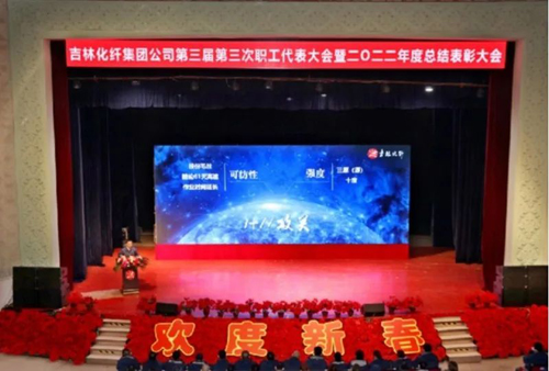 在吉林化纤集团公司第三届第三次职代会暨2022年度总结表彰大会上,集团公司班子成员,各子公司、各中心、部室负责人,中层及以上干部,受表彰的先进集体、优秀个人代表及各单位职工代表共计1200余人参加会议。
