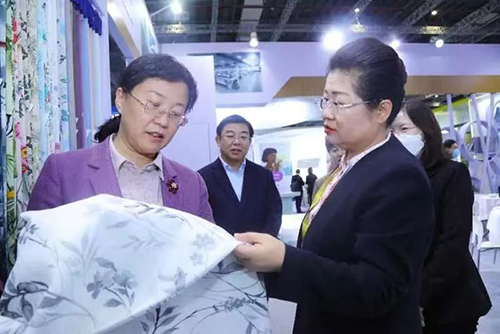 ![]() 魏桥创业集团党委书记、总经理张红霞(前排右一)在2023中国纺联春季联展上向与会领导、嘉宾介绍绿色低碳印染产品