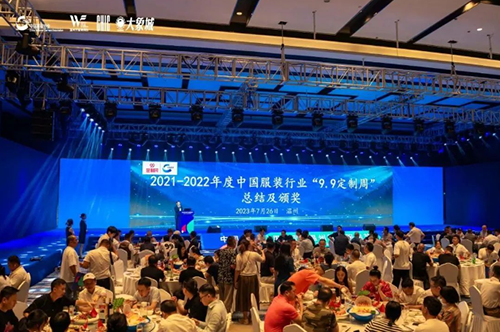 ![]() 26日晚上,2021-2022年度中国服装行业“9.9定制周”总结与颁奖仪式在温州大象城国际宴会中心举办。现场为所罗、衣邦人、鲁泰、大杨、南山等13家企业颁发“9.9定制周服装单品销冠企业”、“ 9.9定制周桂冠定制门店/网店”、“ 9.9定制周金牌面辅料供应商”、“9.9定制周金牌加工商”四个奖项。
