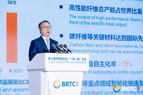 ![]() 国际纺织制造商联合会主席、中国纺织工业联合会会长孙瑞哲在题为《高质量共建‘一带一路’,共创全球纺织产业发展繁荣》的主旨演讲中指出,中国纺织融入“一带一路”建设,实现了多维度、跨越式发展。中国纺织工业制造优势不断夯实、科技创新稳步提升、时尚引领逐渐成势、绿色体系日臻完备;中国纺织的发展带来世界机遇,产品“走出去”满足全球需求、产能“走出去”完善全球体系、资本与品牌“走出去”实现全球价值。