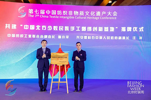 ![]() 中国纺织工业联合会副会长端小平、兴安盟科右中旗人民政府副旗长汪洋就双方共建“中国北方少数民族手工刺绣创新基地”进行了揭牌。
