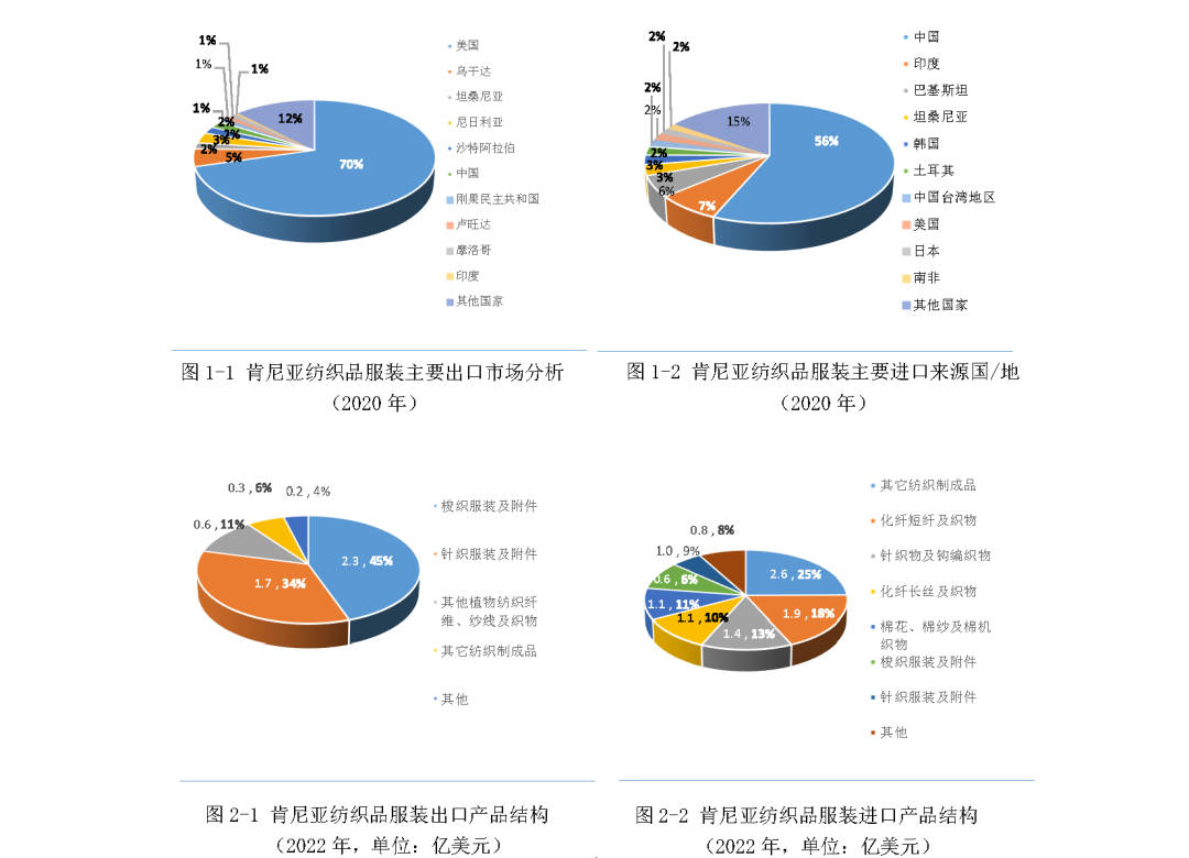 据联合国国际贸易中心(ITC)数据,2020年肯尼亚纺织行业主要产品70%以上出口至美国市场,其余销往乌干达、坦桑尼亚等非洲其他国家。中国则是肯尼亚最大的纺织品服装进口来源地,在进口总额中占比达到56.5%。