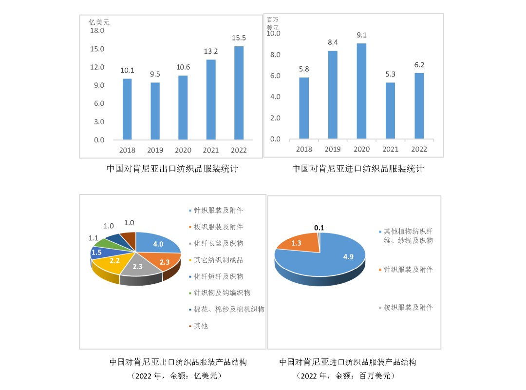 得益于共建“一带一路”合作,中国与肯尼亚双边贸易发展迅速。中国是肯尼亚第一大贸易伙伴和主要外国直接投资来源国,肯尼亚也是吸引中国投资最多的非洲国家之一。2022年1月,肯尼亚同中国签署了一系列双边协定,进一步促进双边贸易发展。中国海关统计数据显示,近年来,中国对肯尼亚纺织品服装出口额保持稳步增长,2022年出口额达15.5亿美元,进口额约624万美元,主要出口产品包括针织服装及衣着附件(占比25.7%)、梭织服装及附件(占比14.9%)、化纤纱线及面料(占比24.7%)等;主要进口产品为麻纤维、纱线及织物,占比高达77.9%。