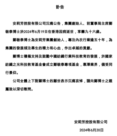 6月20日,安莉芳控股有限公司发布讣告,集团创始人、前董事局主席郑敏泰博士于2024年6月19日在中国香港因病逝世,享年九十六岁。