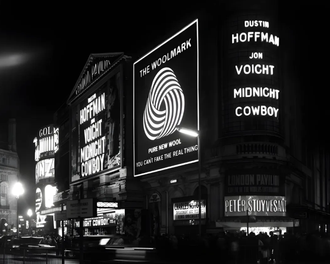 在过去的60年里,纯羊毛标志的品牌价值在服装、室内纺织品和家居洗涤用品等领域得到了广泛的认可。如今,它已成为全球最知名的纺织纤维品牌之一,向供应链和消费者保证,经过认证的产品具有特定的羊毛纤维含量,并且在耐用性、洗涤耐受力以及耐光色牢度和耐液体色牢度等方面已通过严格的质量测试。 ![]() 1969年Woolmark在伦敦的广告