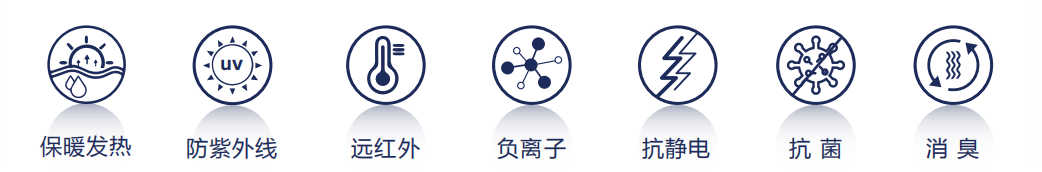 功能特点:保暖发热、抗菌、消臭、抗静电、远红外、负离子
