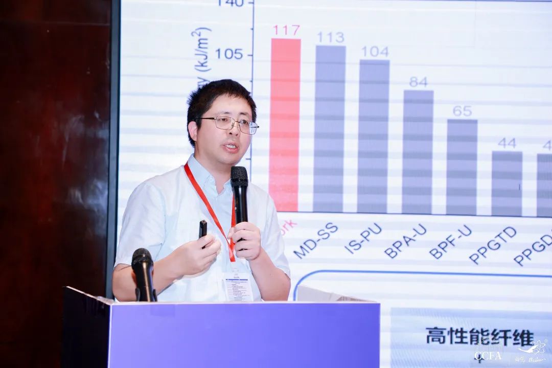 ![]() 东华大学材料科学与工程学院复合材料系主任游正伟介绍了动态共价交联聚氨酯及其纤维。他指出,通过动态聚肟氨酯共价交联纤维的高效制备工艺,可获得适应性共价交联聚肟氨酯纤维;与对应的非共价交联纤维相比,其强度提升28倍、韧性提升74倍。
