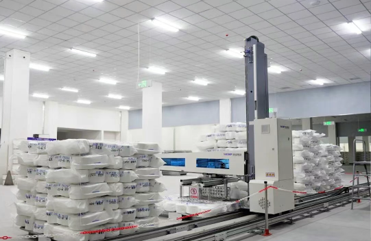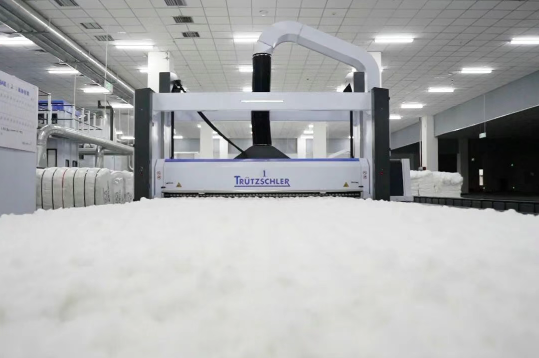 走进宝鑫纺织的智能车间,足以颠覆人们对纺织工厂的传统认知:世界一流的纺织生产设备高速运转,从原料投入到成品出库的全流程几乎无需人工干预。尤为亮眼的是跨楼层全流程筒纱智能包装物流系统,将纺纱、包装、仓储等环节无缝衔接,实现了物料流转的自动化与智能化。