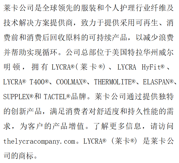 | 莱卡公司宣布可再生莱卡®纤维战略合作,携手天虹国际集团推动可持续纤维应用迈向新阶段 |