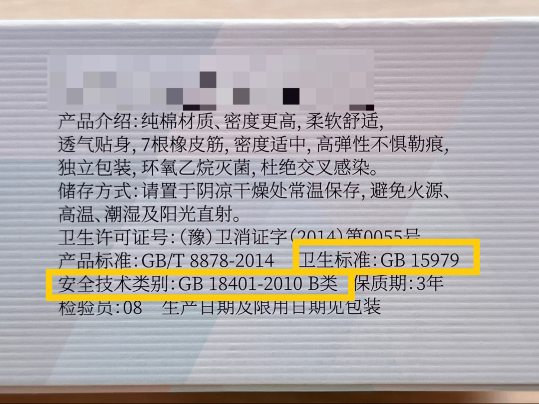 判断产品是否达标,就看产品有没有执行「卫生标准」和「安全技术类别」。执行这两个标准的产品一般会直接标注在外包装上。 根据强制性国家标准GB 15979—2002《一次性使用卫生用品卫生标准》规定,一次性内裤的卫生标准应该符合该要求(新版标准GB 15979-2024《一次性使用卫生用品卫生要求》将于2025年7月1日正式实施。新标准在检测指标上更加全面,对产品的卫生性能提出更高要求)同时,根据强制性国家标准GB 18401—2010《国家纺织产品基本安全技术规范》,直接接触皮肤的产品其安全类别至少应满足B类要求。